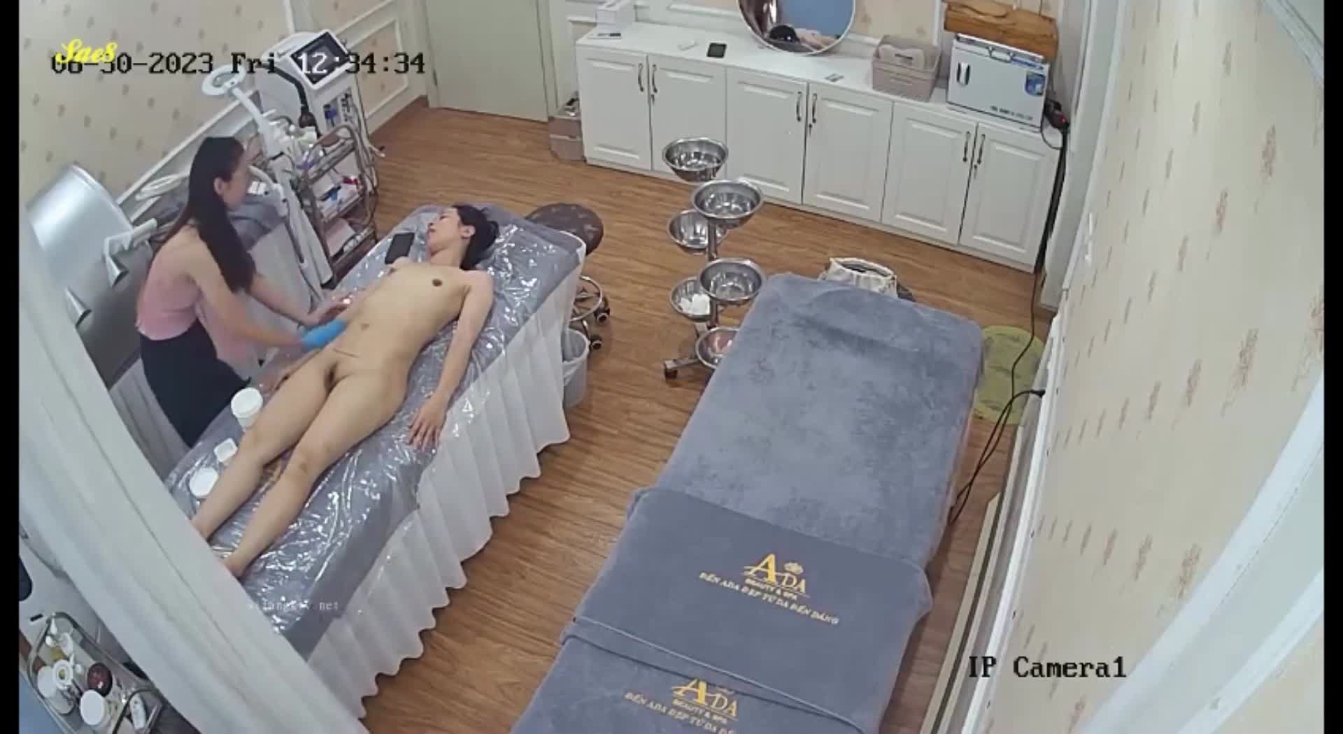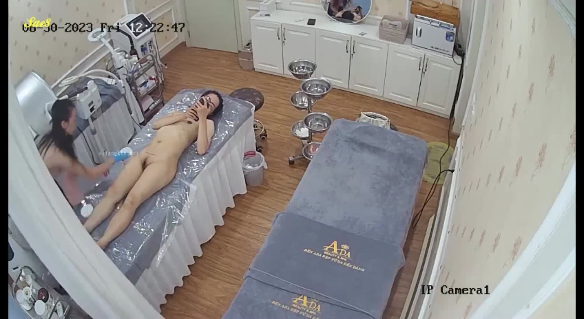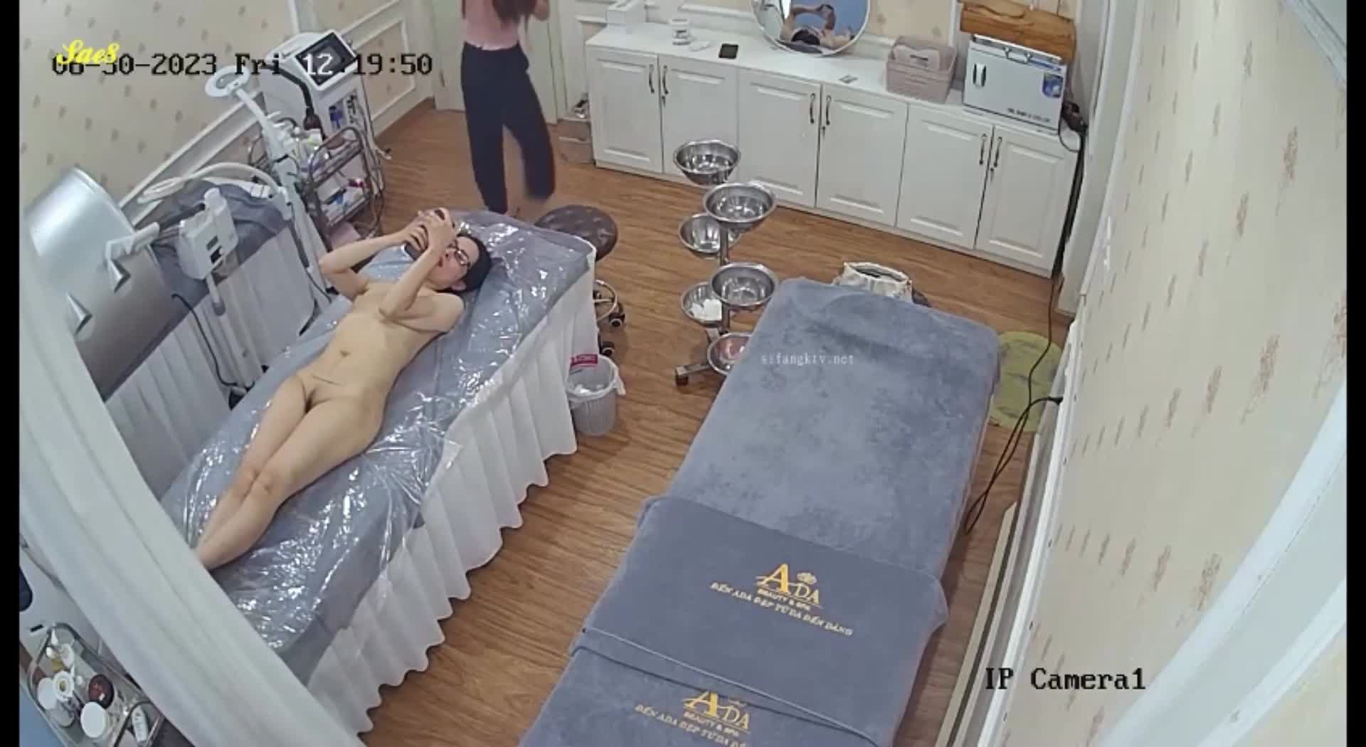 黑客破解美容院监控摄像头偷拍气质眼镜少妇脱光光做SPA纤体美容。